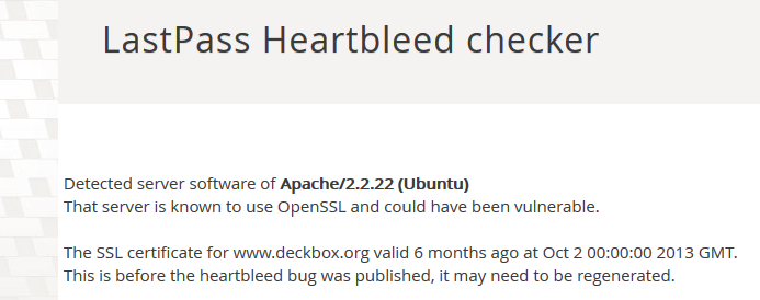 bactgudz wrote:No it is not. Lastpass is notorious for false positives on Heartbleed. Please do some research before trying to cause a scare. I tested it with both Qualys Lab and filipp.io testers and it passed.