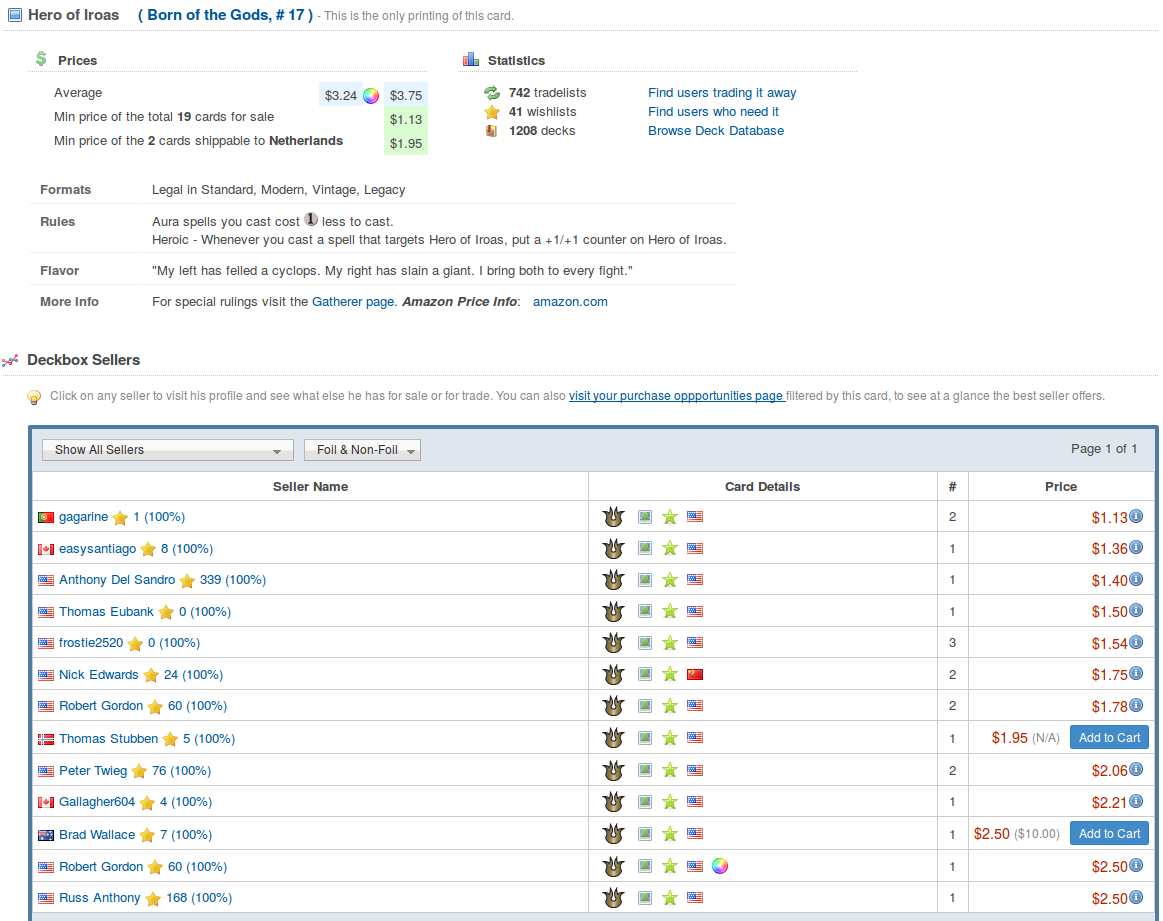 I noticed the pricing on Hero of Iroas was weird. The average price, which is used in trades, is currently listed as 3.24$. However, there's not a single copy on the Deckbox market that is over 2.50$.